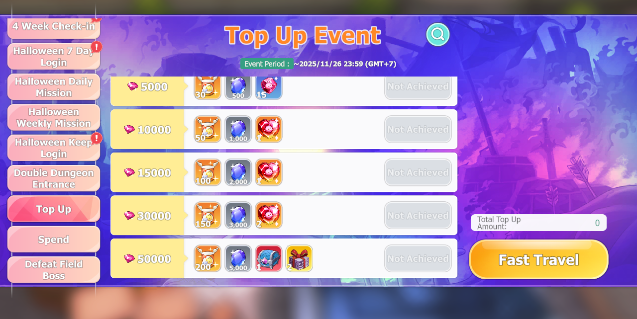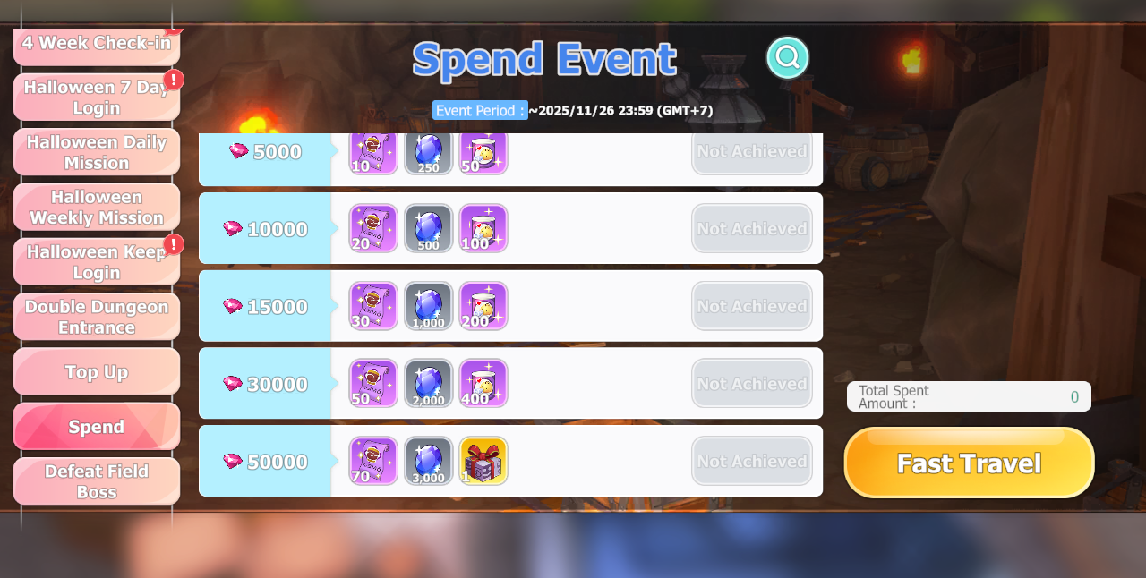 • Spend 50,000 rubies - Heroic Combo EXP Scroll (x70) / Sapphire (x3,000) / Ooparts Summon Achievement (x1)