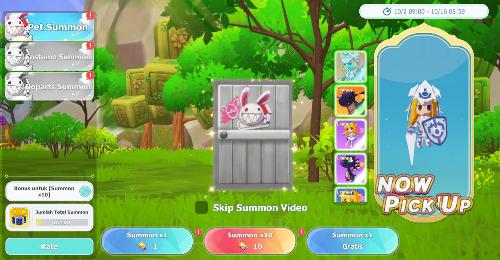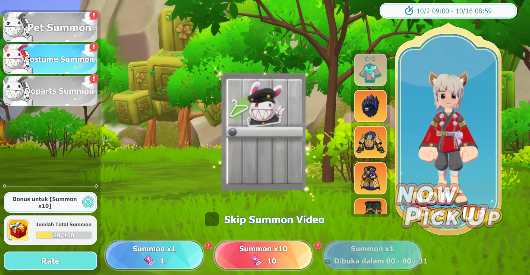 Sekarang adalah kesempatan kamu untuk mendapatkannya selama event, Pet dan Costume yang ditampilkan di sisi kanan akan memiliki rate yang lebih tinggi untuk di-summon!