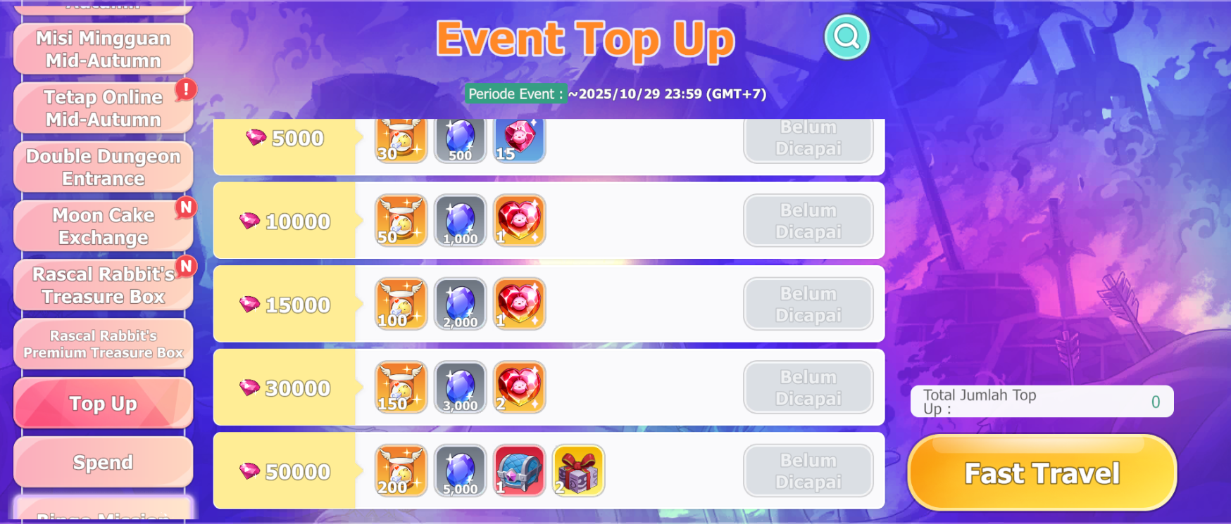 • Top Up 50,000 Ruby - Legendary Pet Food (x200) / Sapphire (x5,000) / Special Ooparts Chest ver.2 (x1) / Ooparts Summon Achievement Chest ver.3 (x2)