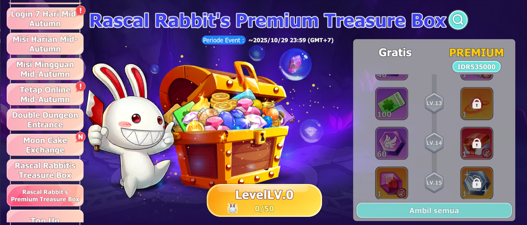 3. Kamu akan menerima hadiah setiap kali kamu meningkatkan level box, dan lebih banyak hadiah dapat diperoleh setelah membeli Rascal Rabbit's Rare Treasure Box.