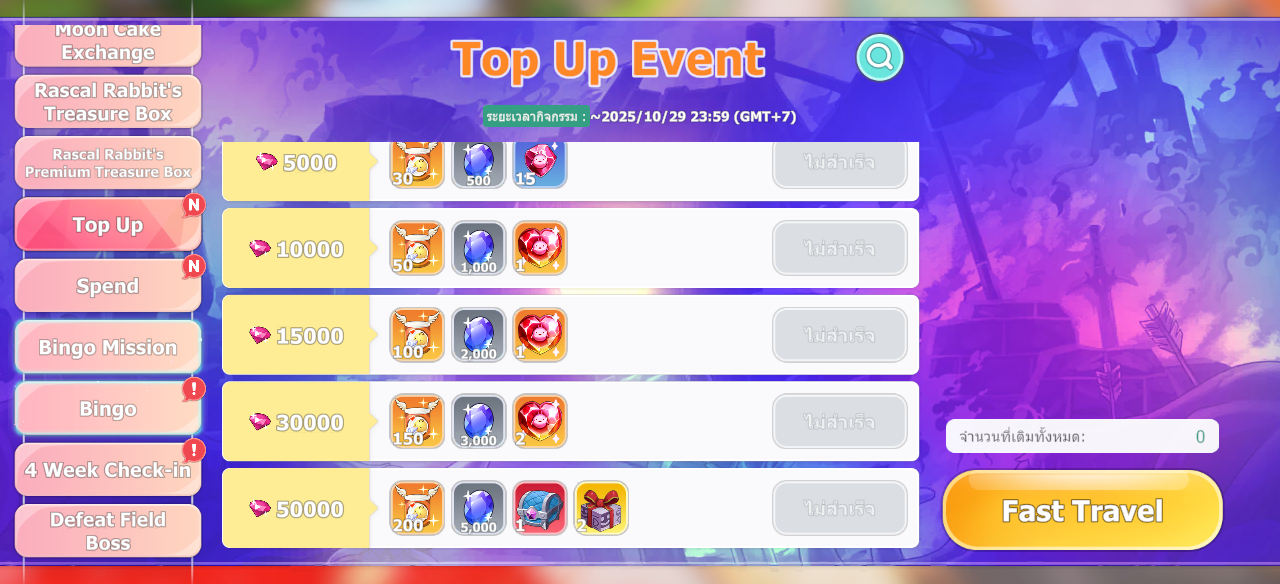 • เติม Ruby สะสมครบ 5,000: Legendary Pet Food (x30) / Sapphire (x500) / Small Pet's Heart (x15)