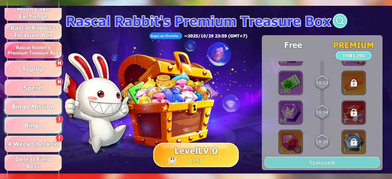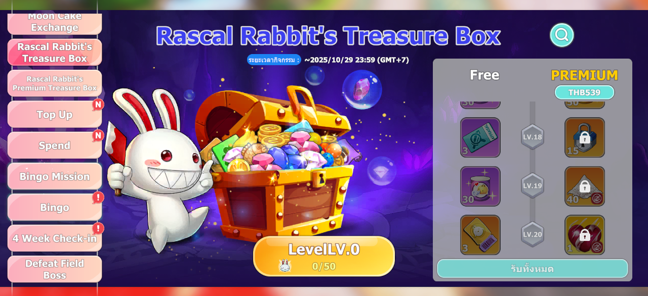 จะสามารถได้รับของรางวัลทุกครั้งเมื่อ "Rascal Rabbit’s Treasure Box" เลเวลอัป และจะสามารถได้รับของรางวัลเพิ่มเติมอีกเมื่อทำการซื้อ "Rascal Rabbit's Premuim Treasure Box"